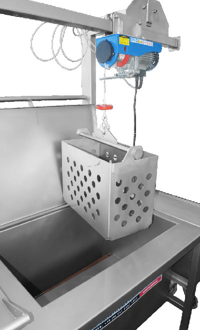The PBA-400MG pasteuriser is an ideal solution for pasteurising of cold-filled bottles. It has a capacity of 2x 200 liters (approximately 200pcs x 1 litre bottles per batch or greater capacity for smaller bottles). The bottles are manually placed into steel box and then they are dived in the hot water bath (using the crane integrated). You can set the pasteurisation temperature and time via a digital display. Then bottles are moved from the hot water bath into the second bath with cold water that cools the bottles to final temperature. The pasteurize process is semiautomatically controlled.