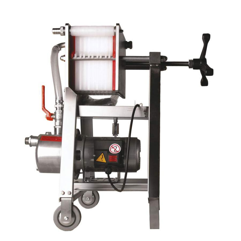 This filtration system involves the use of filter layers “cartons” which are interposed between the plates with frames made of stainless steel. New and very favourably priced handy table top model of the beverage filter with handle and drip tray. Pump without bypass, can also be used separately. Suitable for filtering food liquids such as wine, beer, juice, etc. Not suitable for double filtration. With standard NBR seal for liquids up to 60°C.